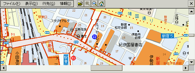 連休中、東京に行っている間に、例のモバイルアトラス MX で利用できる「ここ Navi 位置情報サービス」がどの程度使えるものか、ちょっと実験してみました。試してみたのは連休中に立ち寄った秋葉原、新宿、立川の 3 駅です。どれもそれなりに大きい街なので、PHS 基地局の数も多いかな、と思って。 キャプチャ画像中のポインタは青が PHS 位置情報サービスが示した位置、赤が実際にいた位置(画像は加工してあります)です。