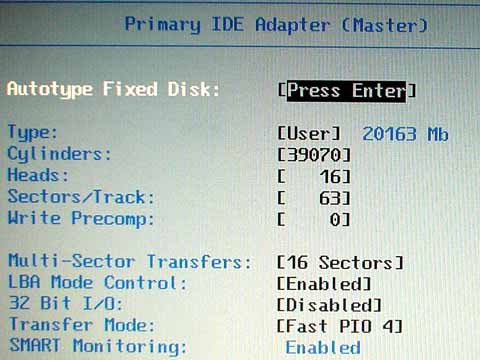 さて、ドライブの設定作業です。ここでは「505EX でオーバー 8GB の HDD を使用する」「IBM DARA-212000」で使ったのと同じ手法で認識させます。DJSA-220 のデータシートによると、Cylinders の値は「38760」に設定すればよさそうなので、BIOS で HDD の Type を「User」に変更して、 Cylinders : 38760 Headers : 16 Sectors/Track : 63 に設定します(データシートを見ると Cylinders の値は「39070」でも良さそうなのですが、そうすると最後尾のパーティションにアクセスしたときに高い確率でフリーズしてしまうので、「38760」にしておいた方が無難だと思います)。 |